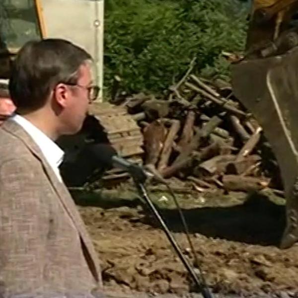 9.14 - Predsednik Vučić obraća se okupljenim građanima Krupnja kojima je rekao je da će biti popravljeni putevi uništeni u poplavama.