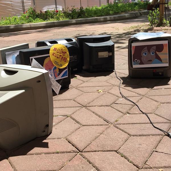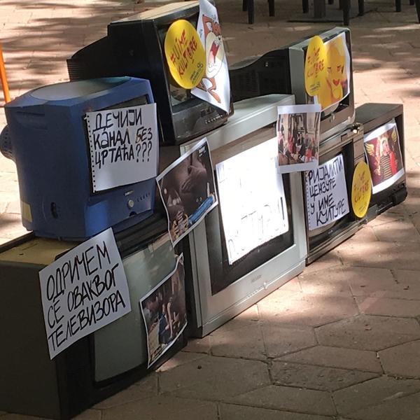Okupljeni građani su doneli televizore s natpisima na kojima je pisalo "U ime kulture", "Dečji kanal bez crtaća"...