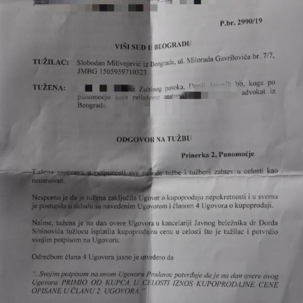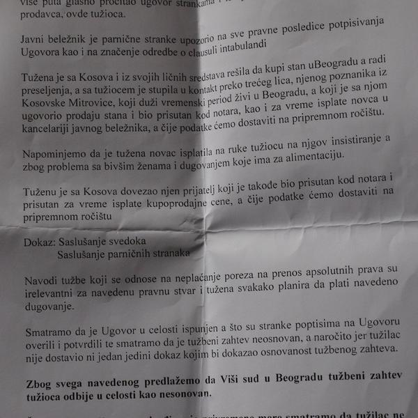 Slobodan nam je rekao da je duže od mesec dana čekao da mu se pare uplate, ali da se to nije dogodilo. Nakon toga je poslao opomenu, a onda je podneo tužbu protiv izvesne gospođe ne bi li došlo do raskidanja ugovora o prodaji stan jer za isti nikada nije uplaćen novac. Gospođa je na tužbu odgovorila preko zastupnika, a gde je osporila sve navode iz tužbenog zahteva, tvrdeći da je isplatila ugovoreni iznos u kancelariji javnog beležnika i to na ruke, a da je Slobodan to potvrdio svojim potpisom na ugovoru.