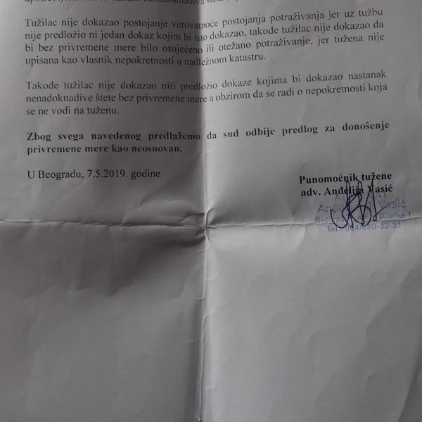 - Ova tvrdnja je potpuno netačna i u najmanju ruku drska, jer ne postoji ni jedan jedini dokaz o uplati ugovorenog iznosa, a u ovu bestidnu laž uvlači i Javnog beležnika za kog tvrdi da je odobrio takvu protivzakonitu isplatu, odnosno isplatu gotovine na ruke, ni manje, ni više nego u njegovoj kancelariji. Što se tiče mojih ćerki, koje su samostalne osobe i ne žive od alimentacije, već od svog rada. Čak je moja bivša supruga dala izjavu da je sve gore rečeno jedna obična besmislica, i da nikada nije ni bilo reči, niti problema u vezi sa alimentacijom. Inače, moja najsatrija ćerka, sa svojom osmogodišnjom ćerkom, kao i mojom osamdesetogodišnjom majkom, takođe, žive u ovom stanu, iz kog će nas pomenuta gospođa bestidno isterati.