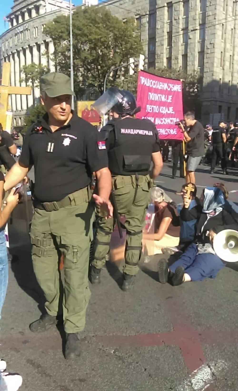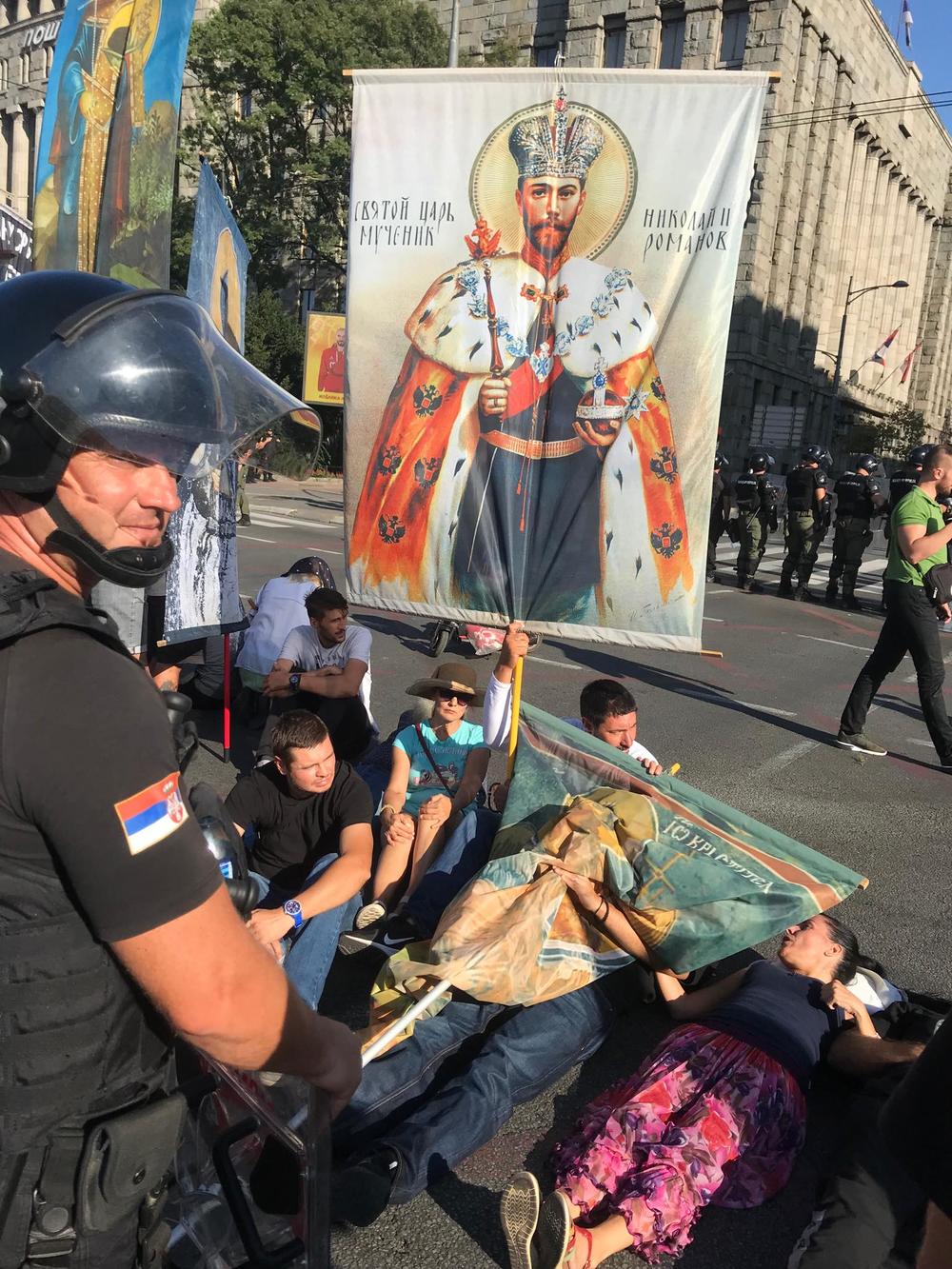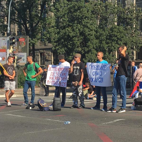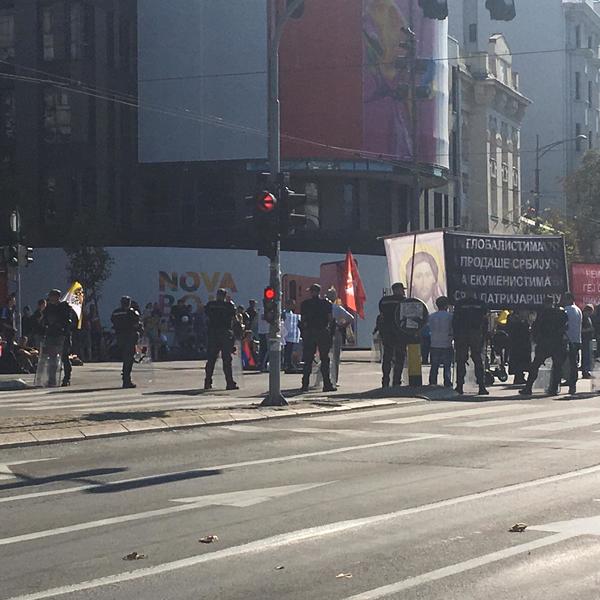 Grupa ljudi na ulasku u Bulevar blokirala je prolaz. Blokada traje već nekoliko sati. Njihova namera je, ako je suditi po transparentima koje nose, da spreče održavanje Prajd šetnje.
