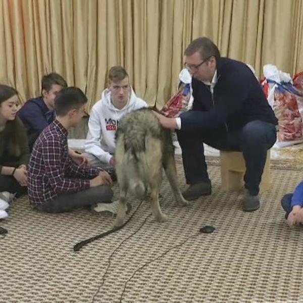 Među klince tada je ušetao i šarplaninac kojeg je dobio na poklon, brat šarplaninca Paše kog je poklonio Putinu, što su mali gosti znali i izgovorili gotovo uglas.
