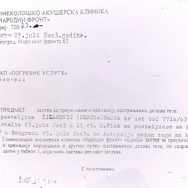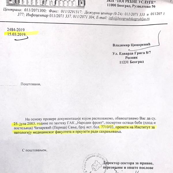 - Nakon što sam se žalio Zdravstvenoj inspekciji i nakon dva inspekcijska nadzora i nekoliko dopisa načelniku zdravstvene inspekcije, dana 04.11.2019. godine, dobijam dopis od Instituta za patologiju da ne poseduju informaciju o sudbini tela mog deteta, a oni su ti koji su izvršili obdukciju.