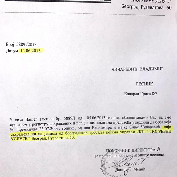 - Kako sve to funkcioniše?! Konkretno kada je Beograd u pitanju, uzimam moj slučaj za primer. Beba je preminula u GAK-u Narodni Front. Front je dužan da pozove JKP Pogrebne usluge da svojim vozilom preuzme leš bebe, kada ga preuzme prebacuje ga na Institut za patologiju radi obdukcije. Kada Institu uradi obdukciju, poziva opet JKP Pogrebne usluge da preuzme leš bebe i odveze u kapelu u Kliničkog centra Srbije iz koje opet njihovo vozilo prevozi dete do grobnog mesta. Na moj zahtev da mi JKP Pogrebne usluge izda potvrdu o tome da je moje dete sahranjeno, dobio sam potvrdu da moje dete nikada nije ni došlo do groblja. Dakle, u mom slučaju beba je dovezena na Institut za patologiju gde je urađena obdukcija, ali tela deteta nema. Postavlja se pitanje šta je Institut uradio sa telom mog deteta, kada ni mene, ni moju tadašnju suprugu niko nije pitao da li hoćemo da preuzmemo leš bebe kako bismo je sahranili ili da li to želimo da dozvolimo državi - priča Čičarević za Espreso.co.rs.