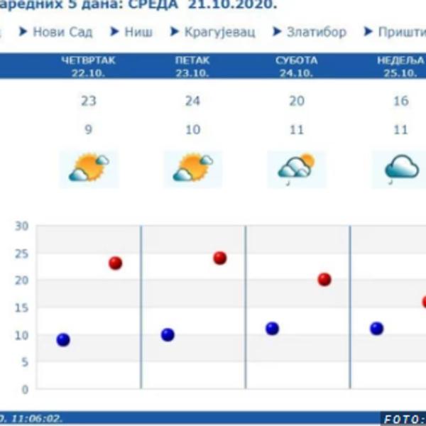 Slično vreme nas očekuje i u subtru, kada je najavljena jutarnja temperatura od 11 stepeni Celzijusa, dok će najviša dnevna biti oko 20 stepeni, ali će kroz čitav dan biti rmurno i ponegde sa kišom. Vraćanje u jesenji režim očekuje nas od nedelje, kada se očekuje zahlađenje i naravno, kiša.