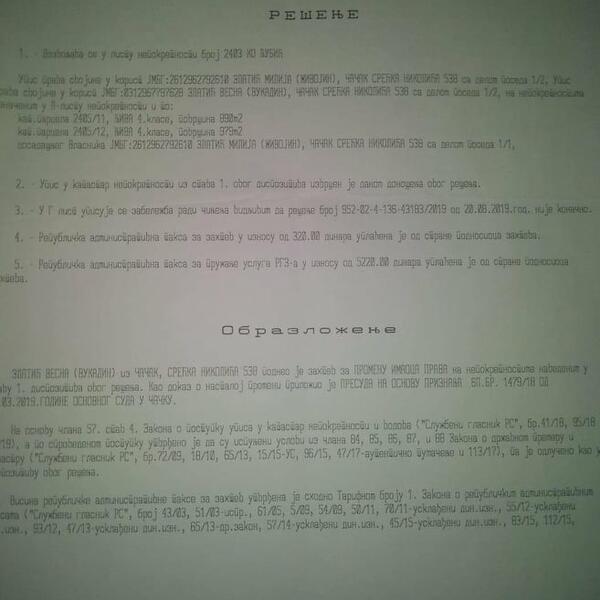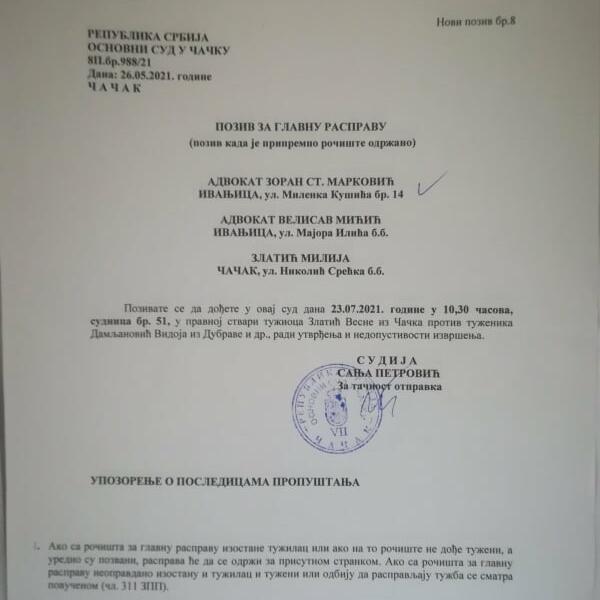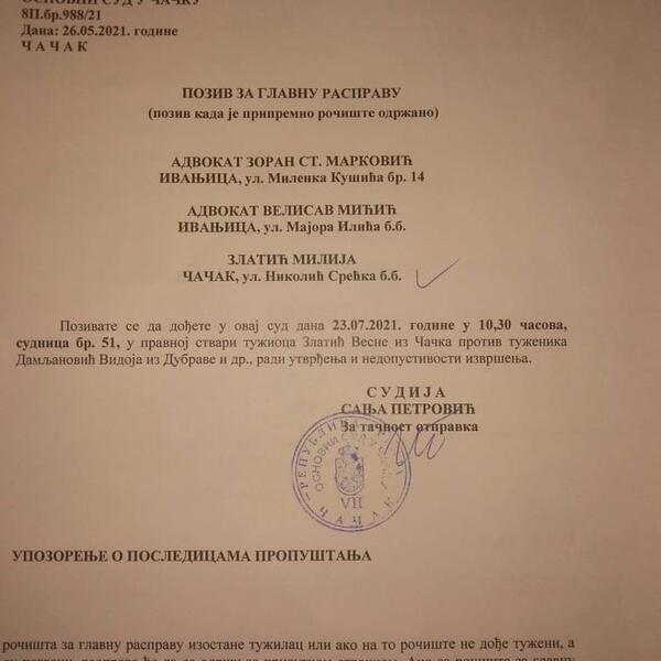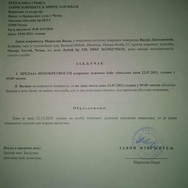 - Izvršni postupak u predmetu II 415/20. koje sprovodi izvršitelj M.I. iz Čačka, po predogu poverioca D.V. prema Z.M., a koje je usmereno prema Zlatić Vesni gde se traži da se iseli iz svoje nepokretnosi u Čačku je protivzakonito i protivustavno jer ne postoji pravni osnov za prednje radnje. Zlatić Vesni je shodno pravosnažnoj presudi Osovnog suda Čačak utvrđeno pravo svojine sa udelom 1/2 idealno, na predmetnoj nepokretnosti koja je predmet izvršenja-iseljenja, tako da je ista vlasnik iste, a obzirom da se radi o idealnom udelu, taj udeo nije fizički odvojen, te se ne vidi kako izvršenje moze da se sprovede. Simptomatično je da je iselenje zakazano dan pre suđenja po tužbi Zlatić Vesne prema poveriocu radi nedopuštenosti izvršenja čija parnica je zakazana za 23.7.2021. U svakom slučaju, izvršitelj je morao da usvoji prigovor trećeg lica iz razloga postojanja pravosnažne oresude kojom se dokazuje pravo svojine trećeg lica na predmetu izvršenja shodno članu 108 i postupak obustavi. Zlatić Vesna je inače prošle godine operisana od kancera, te svako postupanje izvršitelja može dovesti do nesagledivih posledica po njen život i telo. O ovome je obavešteno Ministarstvo pravde i Komora izvršitelja čiji odgovor nisam dobio, objašnjava Marković.