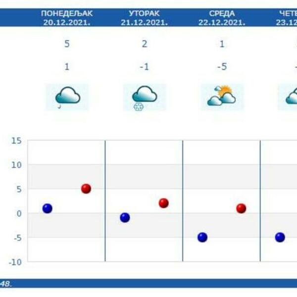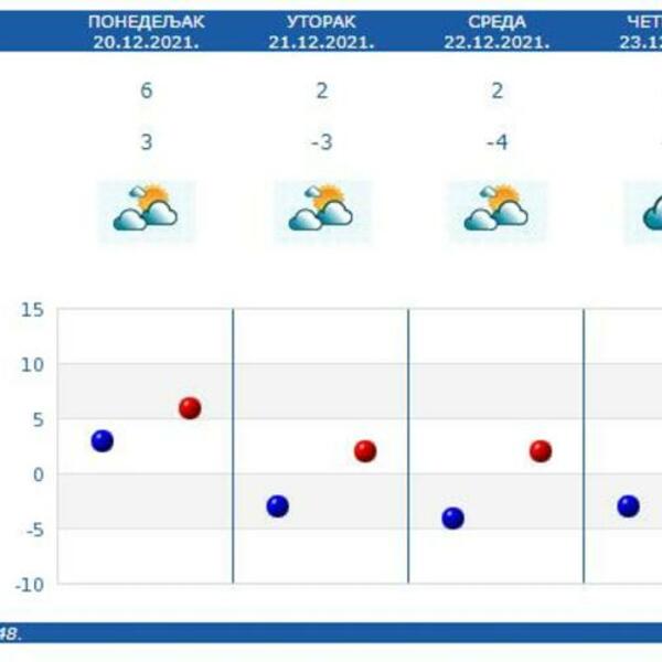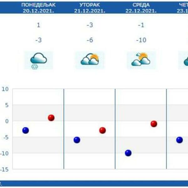 "U utorak i sredu promenljivo oblačno uz sunčane intervale, suvo ali hladno. Jutarnji minimum od -7 do -2, na planinama koje su pokrivene snegom i do oko - 17 stepeni Celzijusa. Tokom dana maksimum od -1 ponegde na istoku regiona do oko +6 na zapadu i jugozapadu", napisao je Čubrilo na Fejsbuku.