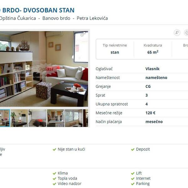 Kontaktirali smo vlasnicu dvosobnog stana na Banovom brdu, stan još uvek nije izdat, ali vlasnica je naglasila da ga ne izdaju na duži vremenski period.