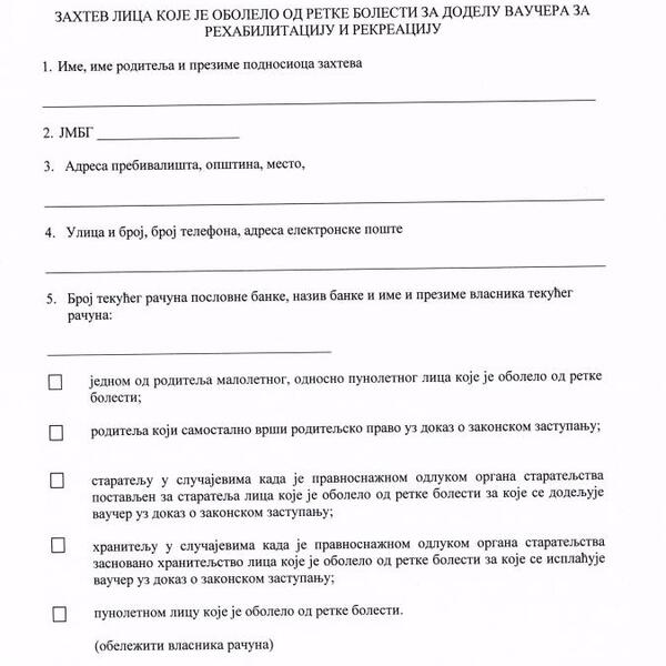 - Licima koja su obolela od retkih bolesti, koji su državljani Republike Srbije i upisani su u registar lica obolelih od retkih bolesti koji vodi Institut za javno zdravlje ,,Dr Milan Jovanović Batutˮ, dodele vaučeri za rehabilitaciju i rekreaciju u iznosu od 50.000 dinara.Save and publish