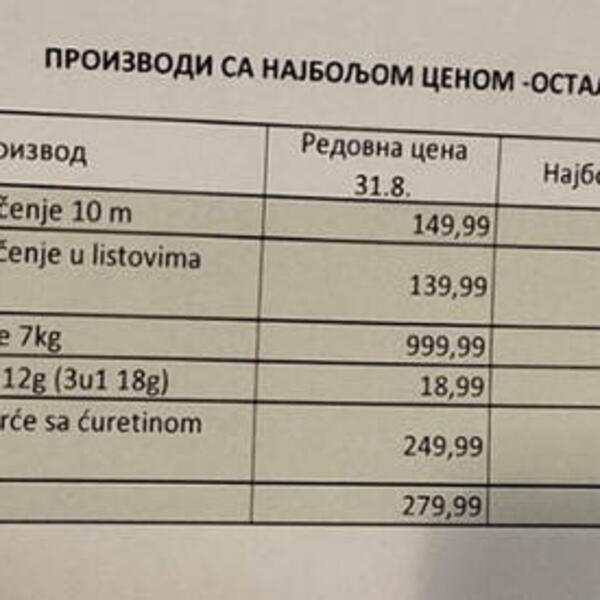 Primera radi, stišnjena šunka će pojeftiniti sa 1.199,99 dinara na 799,99 dinara, šunka u crevu sa 829,99 na 599,99 dinara, krompir sa 84,99 na 59,99 dinara, sir sa 899,99 na 689,99 dinara.