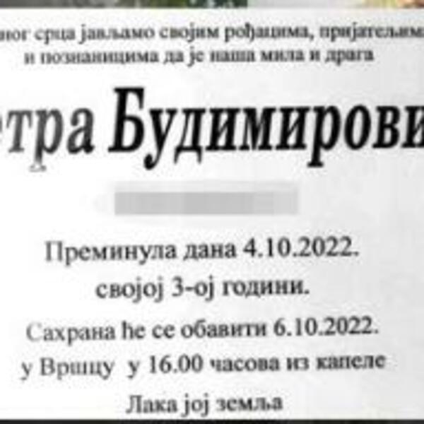 Zločin u Vršcu je nešto što je nedopustivo, ubijeno je dvogodišnje dete, mala Petra koju je rođeni otac ugušio u stanu u kom su živeli. Nakon što je lišio života nedužno dete, monstrum Marko Budimirović oduzeo je sebi život vešanjem. Roditelji deteta bili su u procesu razvoda, a starateljstvo nad malom Petrom pripalo je ocu.