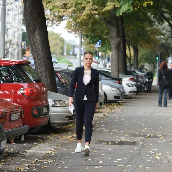 Hrkalovićeva je stigla poslednja od troje optuženih, u teget odelu i belim sportskim patikama.