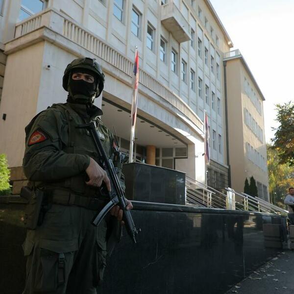 Ispred Specijanog suda nalazi se veliki broj pripadnika Žandarmerije sa dugim cevima