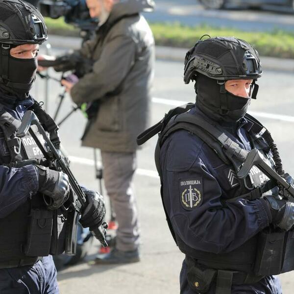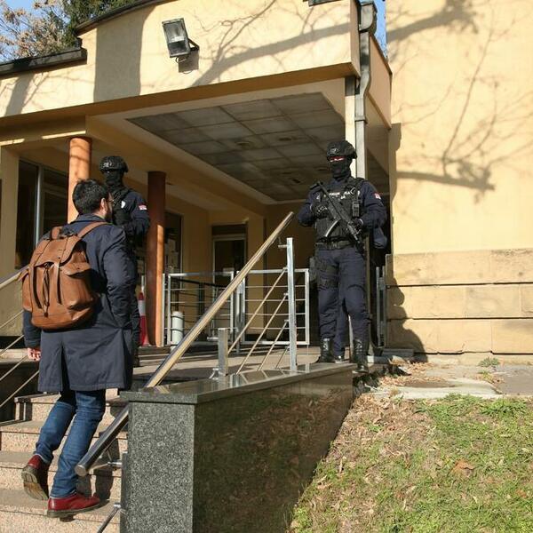 Naoružani pripadnici Žandarmerije s fantomkama i dugim cevima raspoređeni su oko i ispred suda.