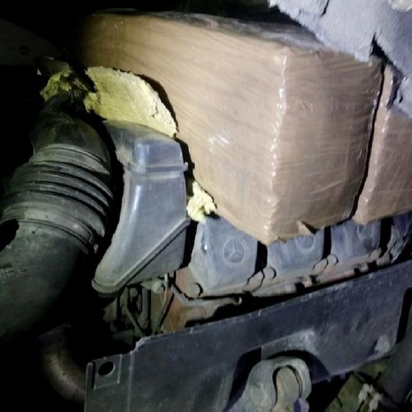 Nakon pregleda na skeneru u tovarnom delu nisu uočene nikakve nepravilnosti, međutim, detaljnim pregledom je u prostoru između kabine i motora pronađeno nekoliko ogromnih paketa oblepljenih selotejpom.