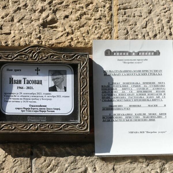U Aleji zaslužnih građana na Novom groblju danas je u 14 časova sahranjen Ivan Tasovac, direktor Beogradske filharmonije, koji je preminuo 29. septembra u svom domu u Beogradu oko 21 sat.