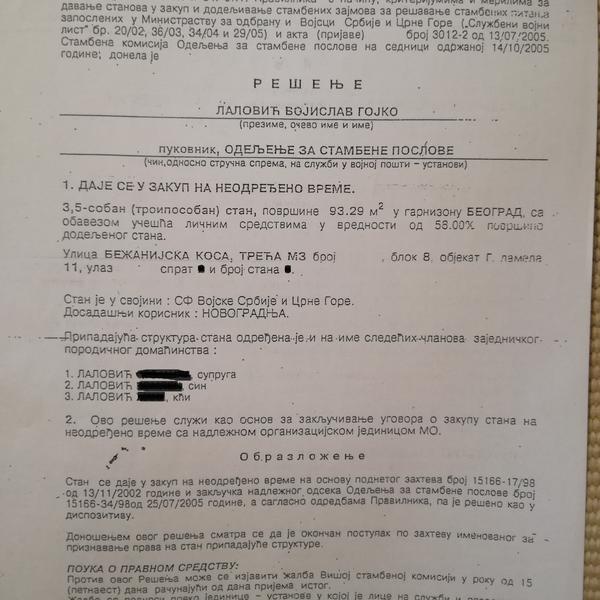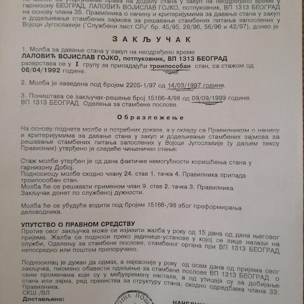 Nevraćanjem u vojnu službu ostaje i nerešeno stambeno pitanje, koje je po opredeljenju delom učešća ličnim sredstvima rešeno donošenjem rešenja o dodeli pripadajućeg stana Up – 1 br 15166-39/98 od 14.10.2005. godine, koje rešenje je prošlo ožalbeni i otužbeni rok što potvrđuju presude USCG 1885/06 od 19.6.2008. i USCG 1869/06 od 3.12.2008. godine, čime rešenje postaje konačno i pravosnažno, što potvrđuje i stambeni organ svojim aktom Up 1 br 15166-46/98 od 13.2.2008. godine uz koji akt dostavlja i rešenje o dodeljenom stanu imenovanom.