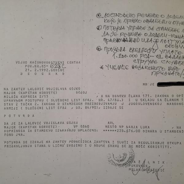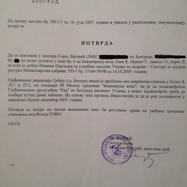 Kao pukovnik sa utvrđenim pravom na stan od 4.1.1993. god. imao sam sve uslove u prvenstvu za dobijanje stana u odnosu na lice kome je stan dodeljen, te sam uložio žalbu. Ulaganje te žalbe je za mene, moju porodicu i moju karijeru bilo pogubno. Jer ne samo da nije pozitivno rešena, već je doneto i rešenje o mom razrešenju iz profesionalne službe br. 11326-2 24.10. 2005. sa danom razrešenja 15.11.2005. godine, navodi Lalović.
