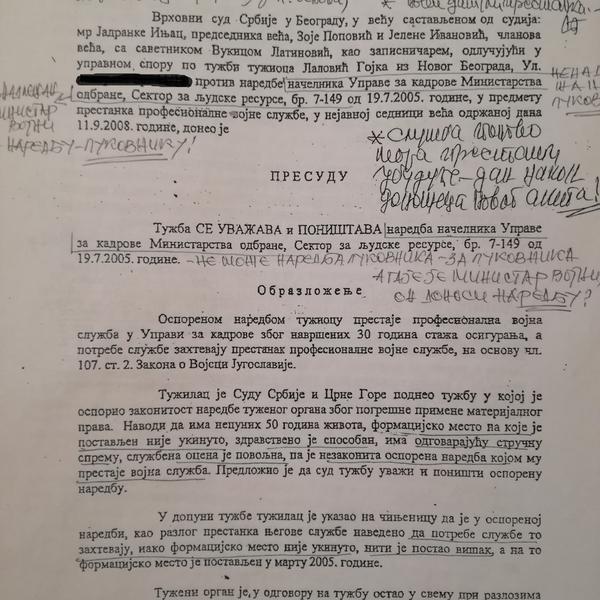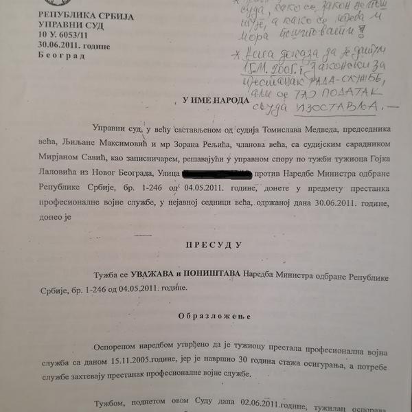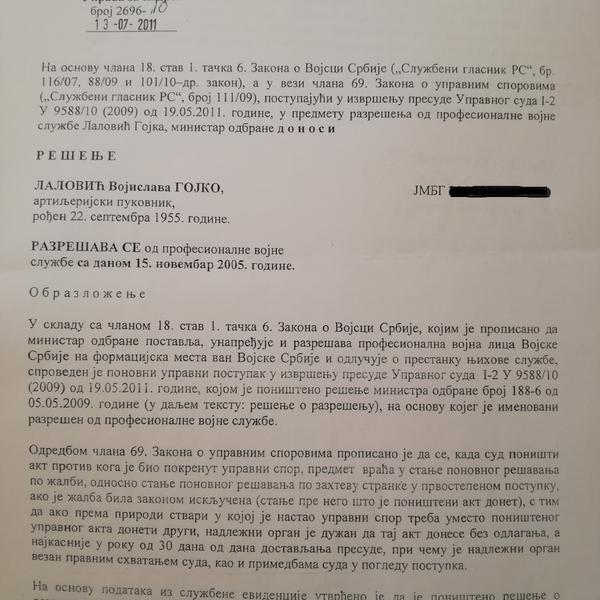 S obzirom na zakonsku činjenicu da je ostanak u službi pukovnika Gojka Lalovića zavisio od zakonitosti naredbodavnih akata, a navedenim odlukama naredbodavna akta oglašena nezakonitim, ispunjeni su uslovi za ostanak u službi. Međutim, u ponovnom postupku po službenoj dužnosti u izvršenju presuda Vrhovnog suda Srbije ministar vojni (tada Šutanovac) za razliku od prethodnih donosi SAM oba naredbodavna akta (i rešenje i naredbu) ponavljajući poništeni datum o razrešenju 15.11.2005. godine, što je suprotno zakonu (novi akt mora nositi datum donošenja novog akta) i pravnim shvatanjima i primedbama suda obavezujućih u navedenim presudama.