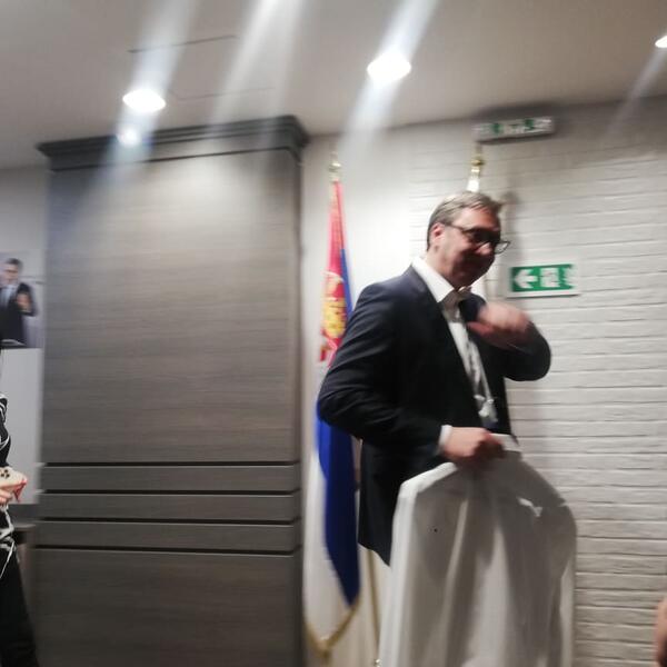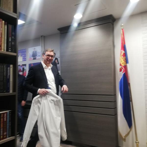 U Štabu Srpske napredne stranke zatekli smo predsednika Srbije Aleksandra Vučića koji je bio u žurbi, ali vidno raspoložen. Ono što smo primetili je da je u ruci nosio belu košulju, aktivistima je poželeo srećan rad, a onda je otišao u prostoriju u kojoj nisu drugi funkcioneri.