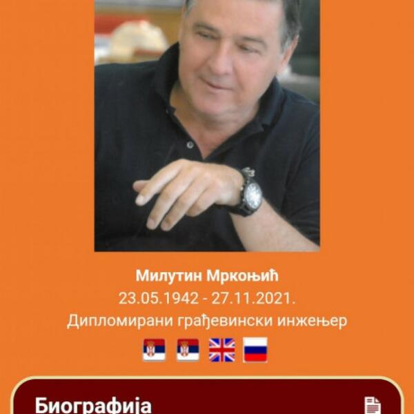 Ukoliko kliknete na opciju "Biografija", između ostalog, moći da pročitate da "Milutin Mrkonjić ostaje upamćen kao izuzetan, nesebičan, častan, porodičan čovek, ostvaren i privatno i profesionalno, borac za progres i socijalnu pravdu, odan prijatelj i životni partner, a pre svega graditelj, i to ne samo neimarskih čuda širom zemlje i sveta, već i mostova među ljudima i narodima."