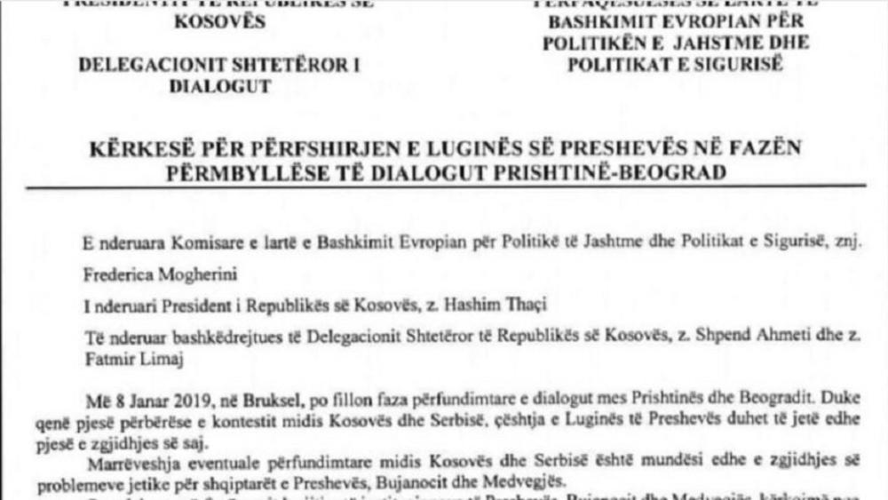Prema njihovom pisanju, predsednik Nacionalnog saveta Albanaca Ragmi Mustafa, gradonačelnik Bujanovca Šaip Kamberi i poslanik u Skupštini Srbije iz te opštine Fatmir Hasani, uputili su inicijativu da se tzv. preševska dolina uključi u završnu fazu dijaloga Prištine i Beograda.