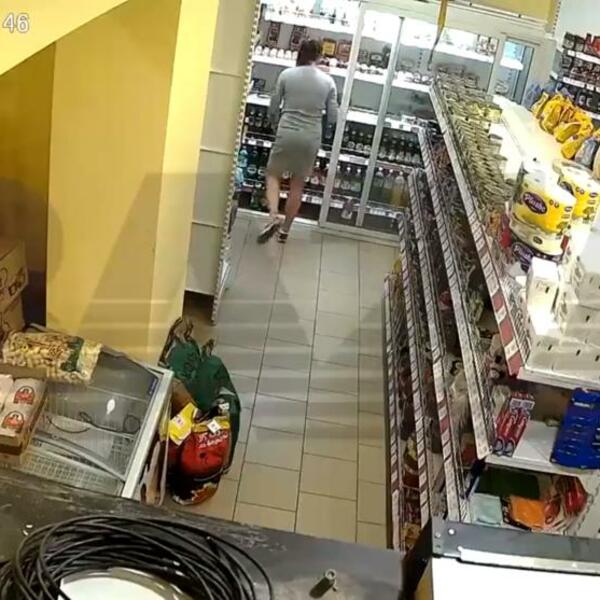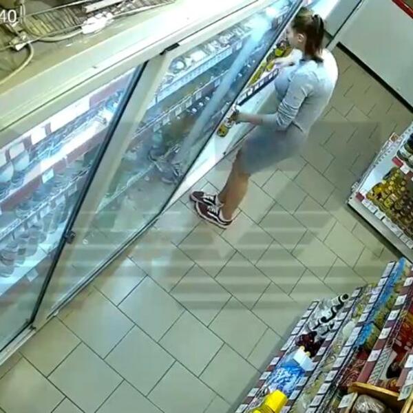 Devojka u uskoj haljini ulazi u radnju i prilazi frižideru. Sa njom je i momak koji joj sve vreme čuva stražu.