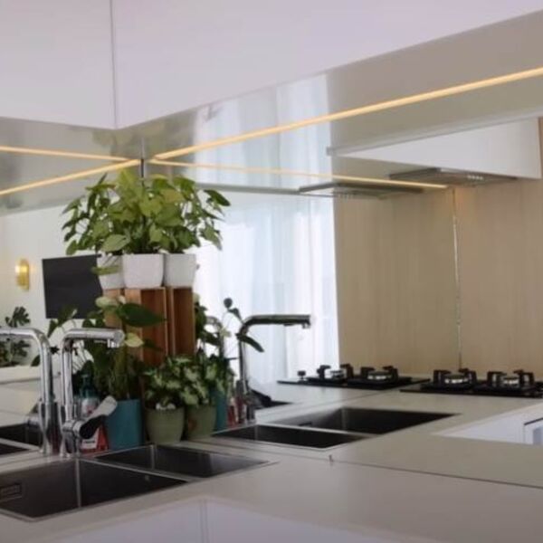 Kuhinja je izvrsno dizajnirana tako da se maksimalno iskoriti mali prostor, a ogledala vizuelno pružaju osećaj mnogo veće kvadrature nego što kuhinjica zapravo ima.