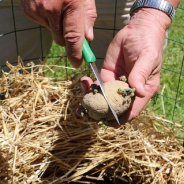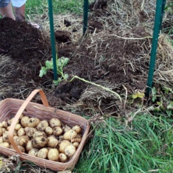 Postavite 4 stuba udaljena oko 30 santimetara, savijete žicu oko njih da bude kao žičana ograda. Pričvrstite da bi čvrsto stajala. Slamu stavite u centar ograde i formirate strukturu gnezda, onda ubacite zemlju u sredinu. Onda isecite krompir i stavite ga u zemlju.
