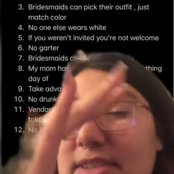 Džezmin Kruz je na TikTok-u objavila video u kojem je podelila svojih 11 najboljih pravila i želja za veliki dan. Otkako su objavljeni, njeni snimci su postali viralni, a komentatori su se oduševljeno složili s odlukom da preskoči bacanje podvezica i pusti svoje deveruše da same biraju haljine.