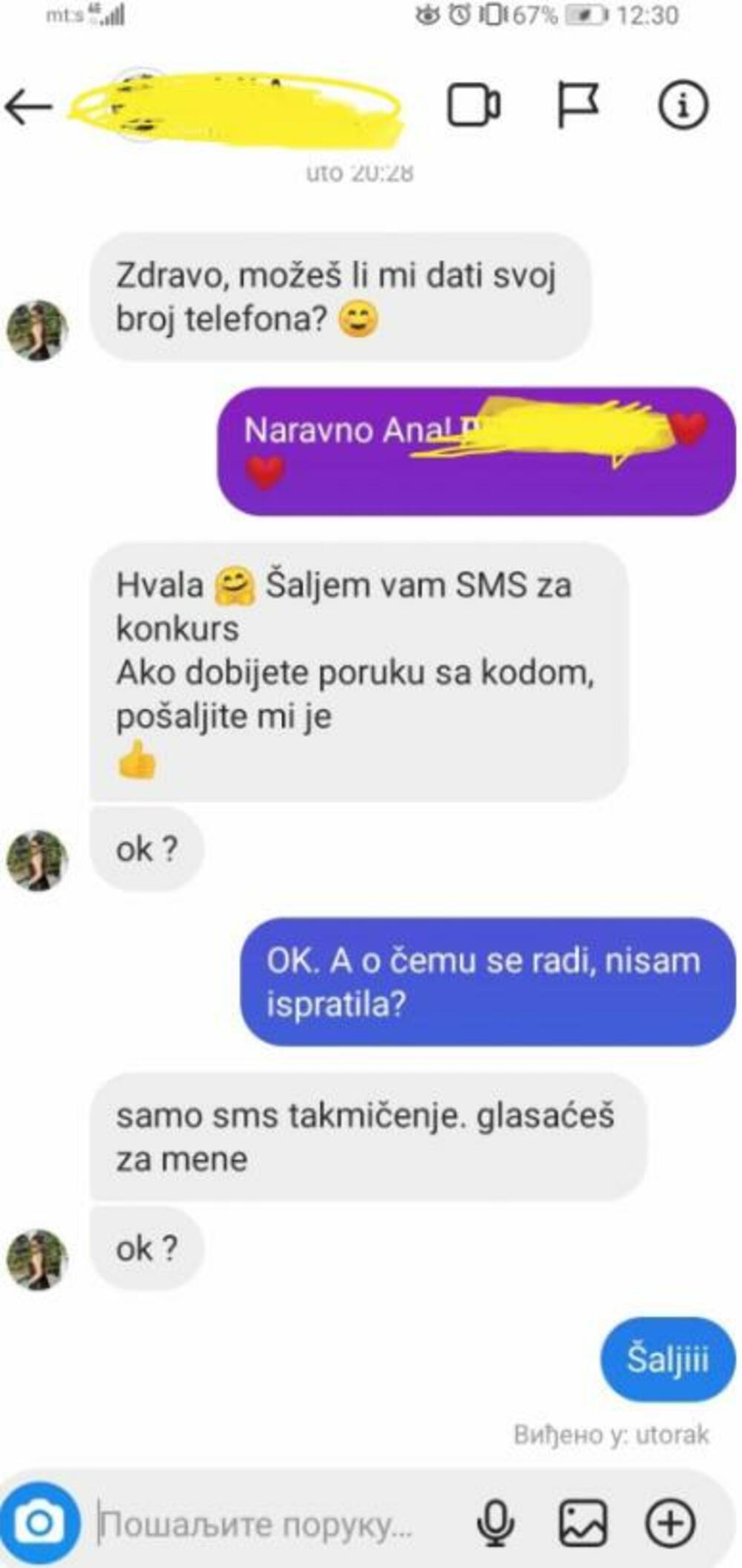 „Poslaću ti kod SMS-om, a kada klikneš daješ mi glas, je li ti to u redu?“, bio je taj glavni zahtev u sandučetu na Instagramu, a oni koji to prihvate dobijali bi SMS sa kodom. Taj kod treba da iskopiraju i pošalju, a tada se automatski s njihovog postpejd računa za telefon skida novac! – objasnila je za Alo! jedna od influenserki koja je bila žrtva prevare.