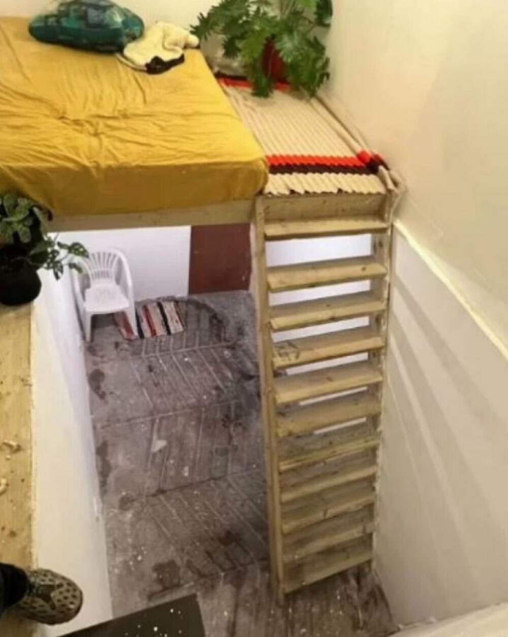 Vrhunac cele priče je da se usred prostorije nalaze drvene merdevine koje vode do kreveta koji je "na sprat", a najjeziviji momenat nije ni stari sunđer bačen po podu koji predstavlja alternativni krevet, već što je sa jedne starne kreveta zid, a sa druge je "ambis". Osoba koja bi legla u tu vrstu improvizovane prostirke bi doživotni invaliditet, budući da se sa druge starne kreveta pada dirketno u prizemnlje. Od ostatka nameštaja tu je bela stara plastična dvorišna stolica i neka vrsta minijaturne podne prostirke.