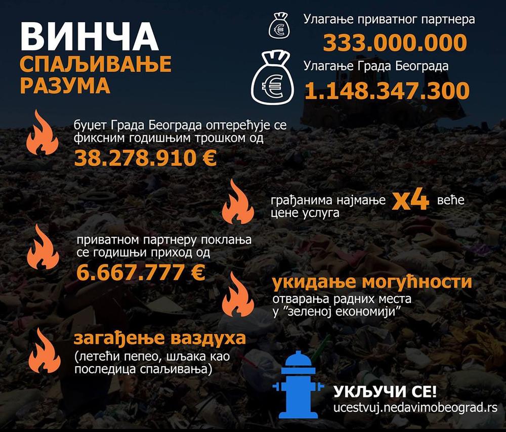 Privatizacija deponije u Vinči i izgradnja spalionice za grad Beograd donose ogromne finansijske obaveze (od preko 38 miliona evra godišnje), kako za sam Grad tako i za kućne budžete građana i građanki. Ako ste do sada plaćali račun za odnošenje otpada 150 dinara, u skoroj budućnosti ćete za ovu stavku izdvajati 600 dinara. To je poskupljenje od čak četiri puta. Ova ekološka i ekonomska katastrofa će imati dugoročne i nesagledive posledice po budžet Grada i živote građana. Zbog svega toga smo odlučili da baš na ovom mestu predstavimo deo programa Inicijative Ne davimo Beograd koji otpad ne tretira kao problem nego kao resurs.