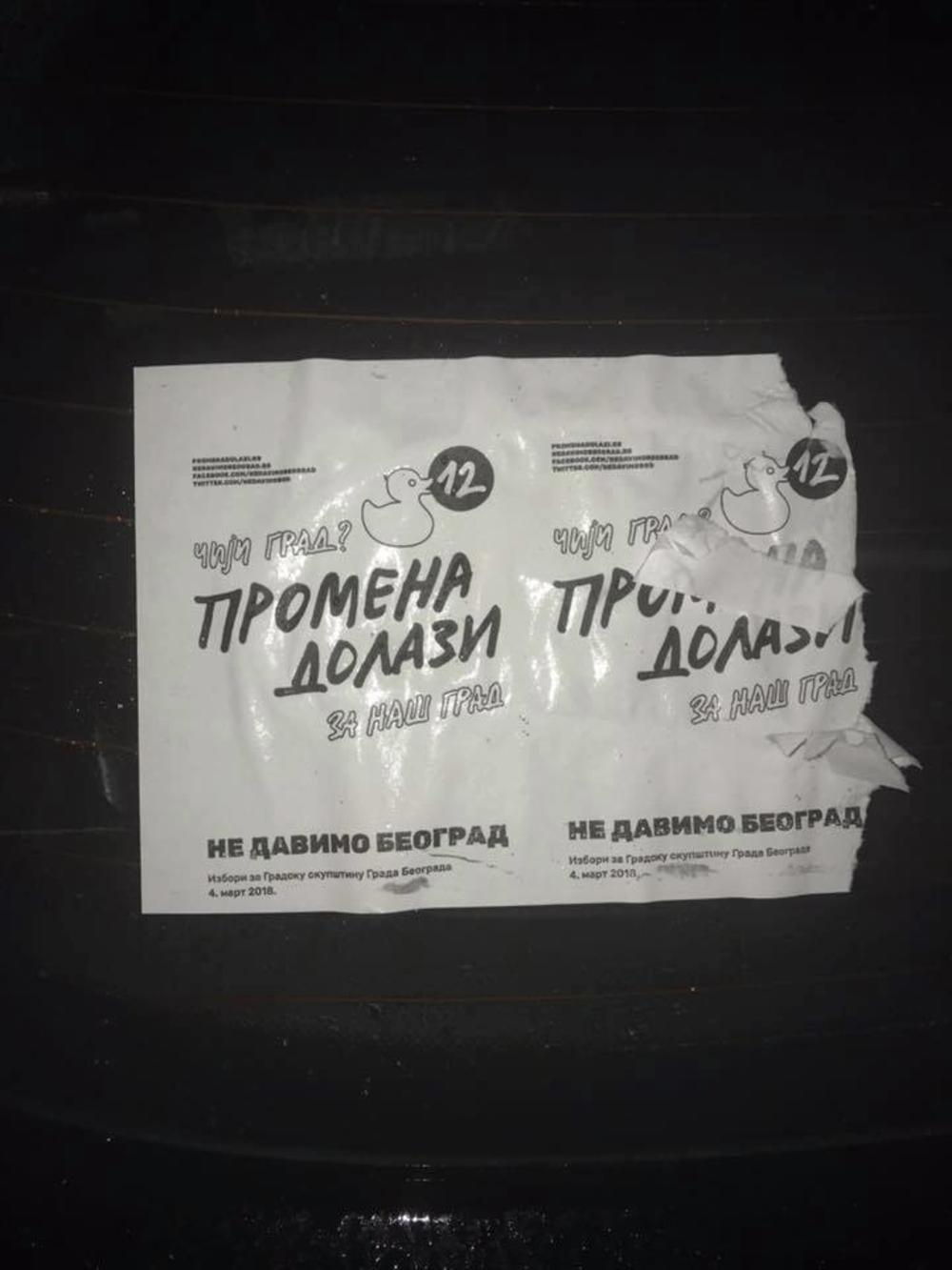 "Do sada su podmetanja, pritisci i pretnje koje inicijativa Ne davimo Beograd dobija bile usmerene samo protiv naših aktivista, ali sada se one očigledno šire i na oštećivanje imovine ljudi koji nemaju nikakve veze sa nama.