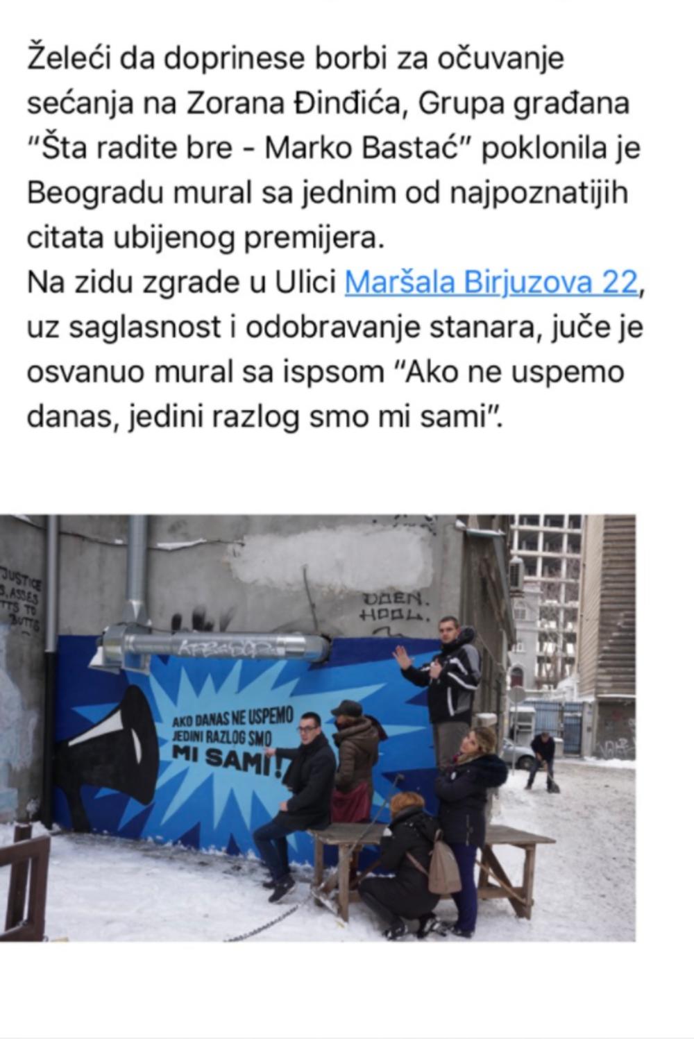 Grupa građana, "Šta radite bre - Marko Bastać" je želela da doprinese borbi za očuvanje sećanja na Zorana Đinđića pa je poklonila Beogradu mural sa njegovim najpoznatijim citatom.
