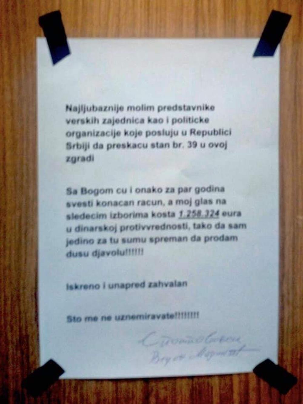 - Najljubaznije molim predstavnike verskih zajednica kao i političke organizacije koje posluju u Republici Srbiji da preskaču stan broj 39 u ovoj zgradi.