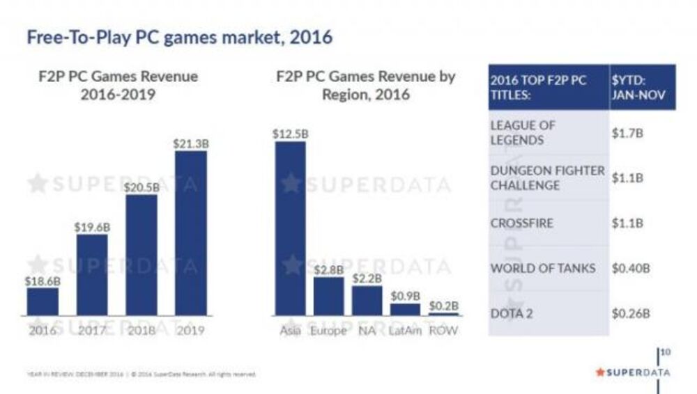 Na polju free to play naslova, na mestu broj jedan je i dalje League of Legends koji im je u 2016. doneo vrtoglavih 1.7 milijardi dolara. Zaslugu za to uglavnom ima azijsko tržište sa akcentom na Kinu i Južnu Koreju gde su free to play naslovi najzastupljeniji i gde, paradoksalno, igrači daje najviše para na virtuelne drangulije.