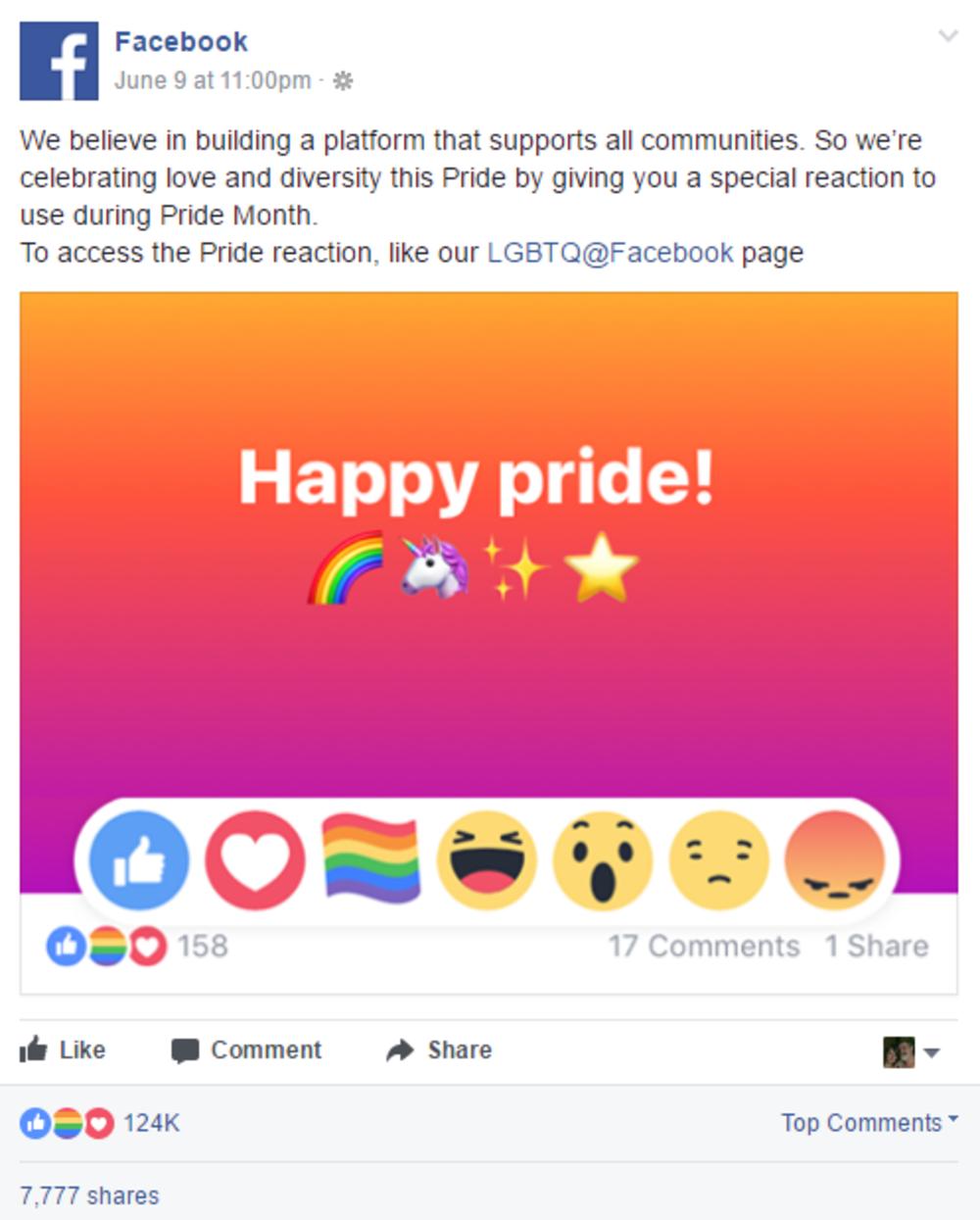 Pored već uobičajenih lajka, srca, smeha, šoka, tuge i besa, pojavila se i čuvena zastava u duginim bojama, koju je kreirao Gilbert Baker 1978. godine. On je preminio u martu ove godine, a Fejsbuk je u njegovu čast jun mesec nazvao Pride Month.