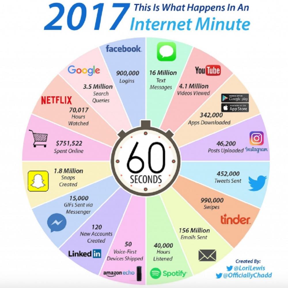 Kompanija Visual Capitalist, koja stvara zanimljive grafikone, pokušala je na jednom grafikonu da opiše šta se sve događa u samo jednom minutu na internetu: