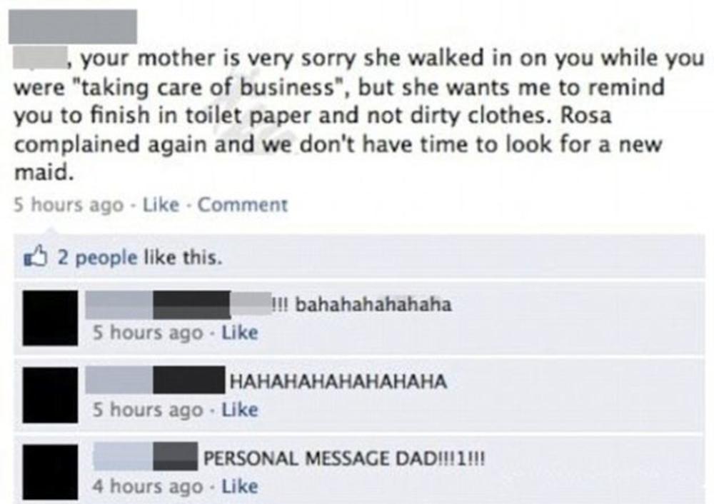 - Tvojoj mami je jako žao što ti je uletela u sobu dok si se zadovoljavao, no rekla mi je da ti kažem da svršiš u toaletni papir, a ne u prljavu odeću. Rosa se opet požalila na to, a nemamo vremena tražiti novu spremačicu - poručio je jedan otac sinu... I svim svojim i njegovim prijateljima.