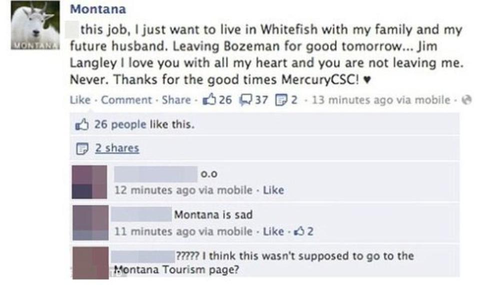 - Jebeš ovaj posao, samo sam htjela živeti u Whitefisheu sa svojom obitelji i budućim mužem. Odlazim sutra iz Bozemana zauvek. Jim Langley, volim te svim svojim srcem i nećeš me ostaviti. Nikad. Hvala ti za lepe trenutke - dirljiv je status... Koji je neko greškom objavio na stranicama Montane.