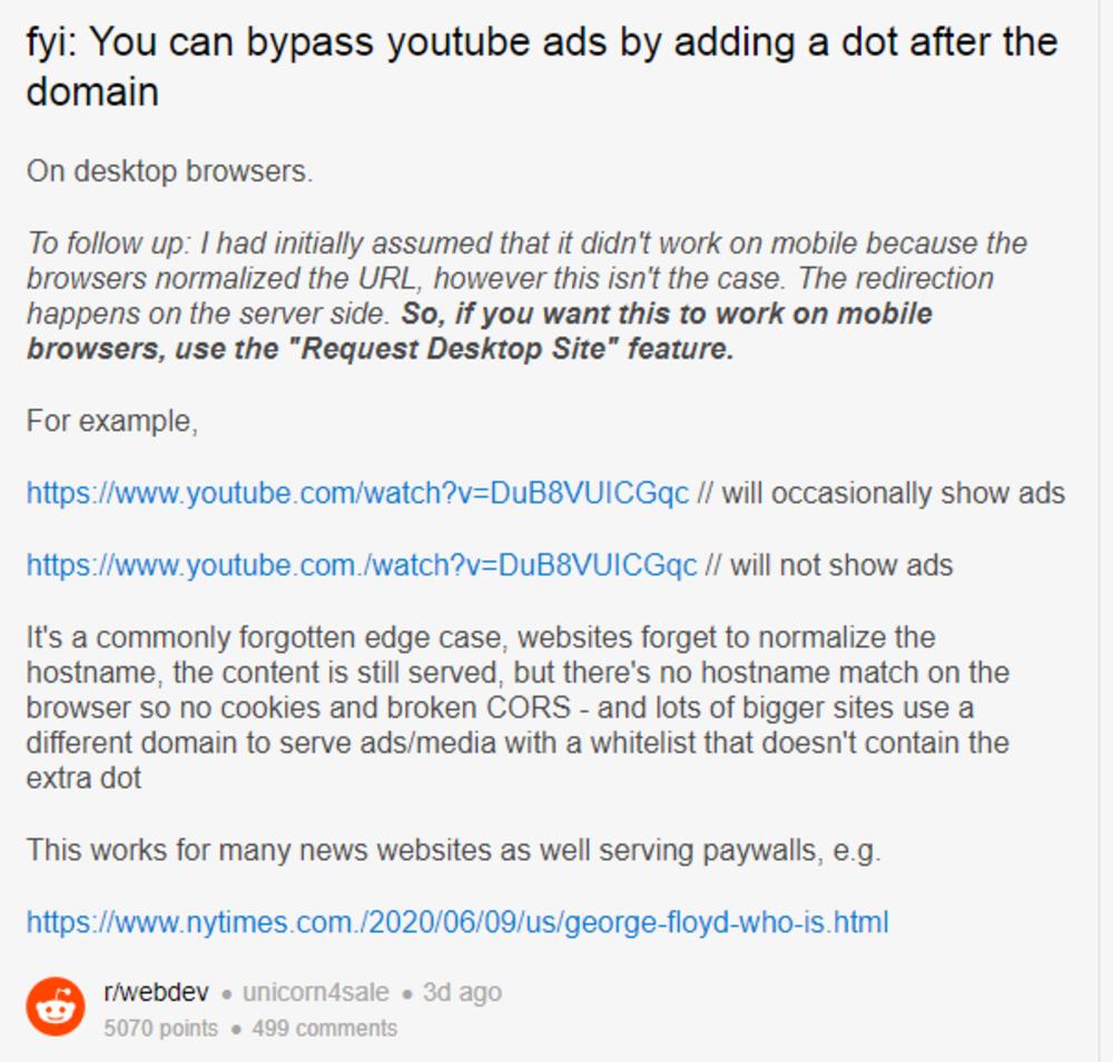 Sve što treba da uradite jest da stavite tačku iza ".com". Osim što ta caka uklanja oglase koji se prikazuju pre videa, uklanja i reklamne prekide usred snimka. The Verge piše da URL sa tačkom više funkcioniše ako ga zalepite u novi, inkognito prozor, ali korisnici Redita tvrde da funkcioniše i sa jednostavnim rifrešom u prozoru u kojem već jeste (u to smo se uverili i mi).
