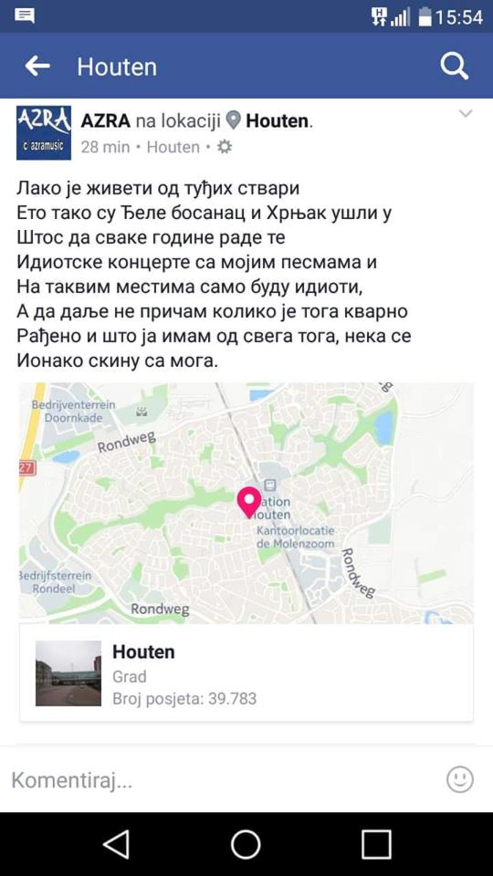- Lako je živeti od tuđih stvari. Eto tako su Đele bosanac i Hrnjak ušli u Štos da svake godine rade te Idiotske koncerte sa mojim pesmama i na takvim mestima budu samo idioti, A da dalje ne pričam koliko je toga kvarno Rađeno i što ja imam od svega toga, neka se Ionako skinu sa moga - napisao je Azra iz Houtena.