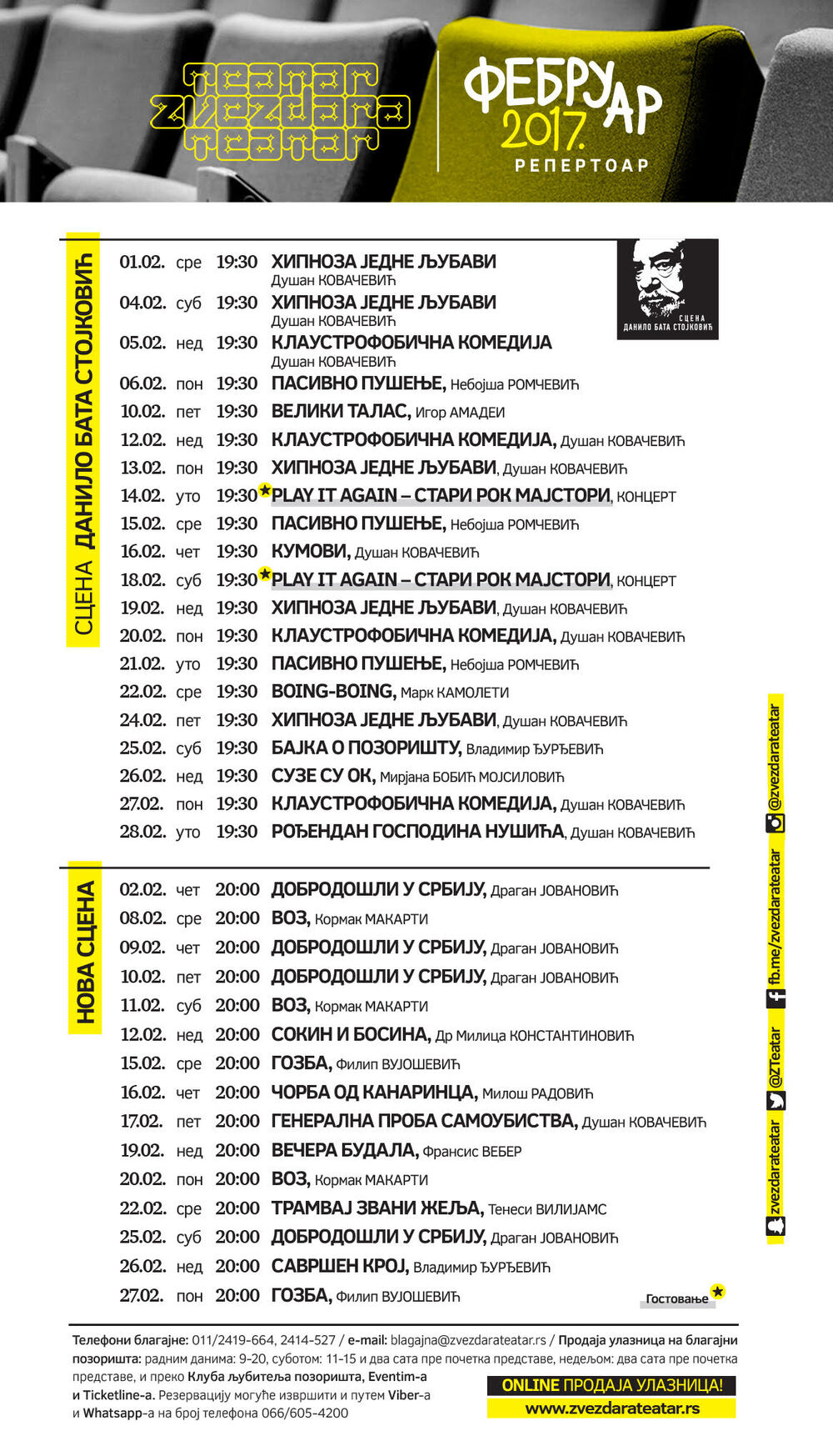 Zvezdara Teatar obaveštava ljubitelje pozorišta da je počela prodaja ulaznica za februarski repertoar, sa koga izdvajaju nove komedije "Gozba", koja se na komičan način bavi problemima savremene srpske porodice, "Pasivno pušenje", koje će vas nasmejati zabunom koja nastaje na pariskom aerodromu i "Hipnoza jedne ljubavi", modernu bajku o ljubavi i odlascima.