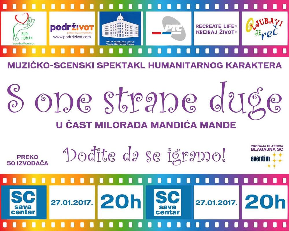 U čast nedavno preminulog glumca Milorada Mandića Mande, emisija "S one strane duge" biće pripređena uživo u Velikoj dvorani Sava centra 27. januara od 20 časova.