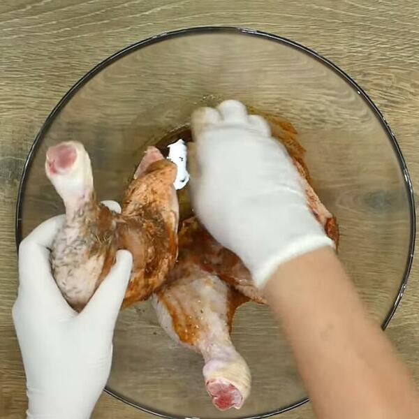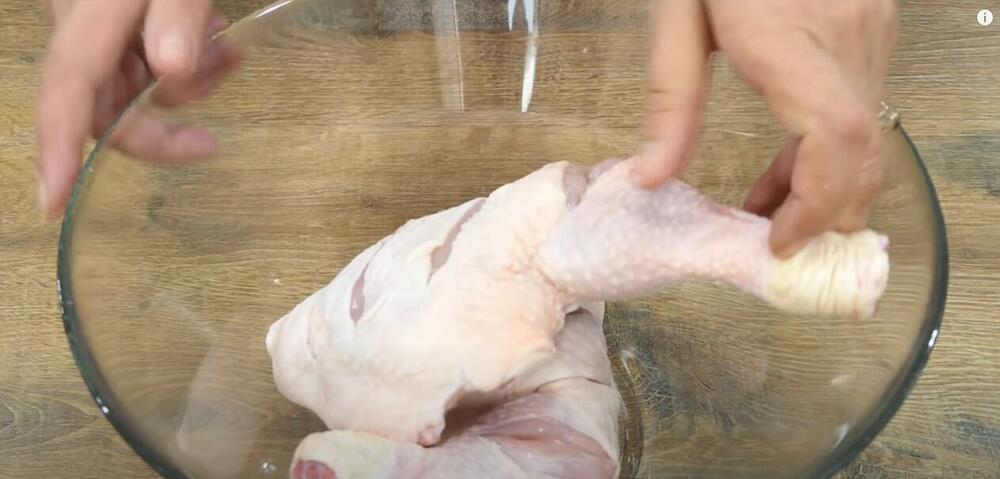 Pomešajte maslinovo ulje, soja sos, so, biber, slatku papriku. Sve lepo sjedinite i batake zasecite, pa lepo utrljajte marinadu. Pokrijte providnom folijom i stavite u frižider na sat vremena. Kratko propržite batake na zagrejanom ulju, tek da dobiju boju. Izvadite meso iz tiganja, pa u isti dodajte seckanu šargarepu i crni luk. Zatim dodajte pirinač koji ste prethodno oprali i kratko propržite. U tepsiju stavite pirinač, crni luk i šargarepu, pa promešajte. Zatim sipajte bujon (napravite ga tako što ćete u vodi rastvoriti kocku supe). Pobiberite i poređajte batake. Premažite ih preostalom marinadom. Pecite u prethodno zagrejanoj rerni na 200°C oko 25 minuta.