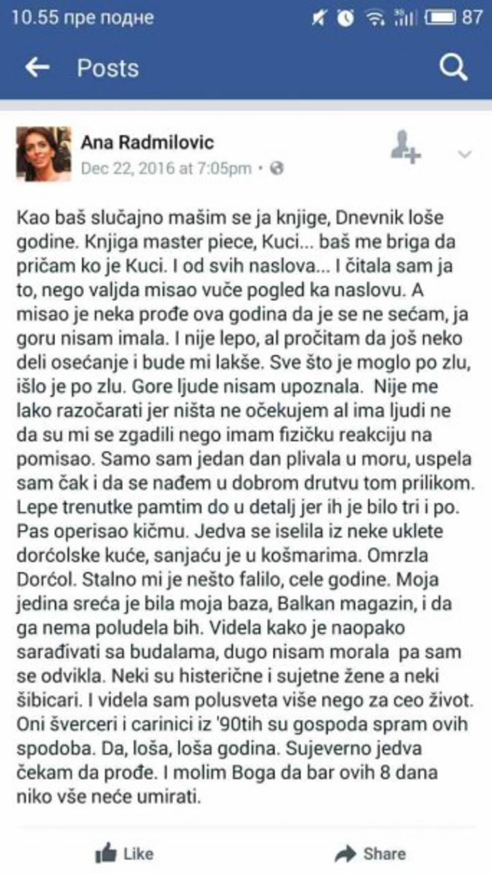 - Moja i naša draga i divna Ana Radmilovic preminula je sinoć, 7. februara, pred ponoć. Volim je zauvek".