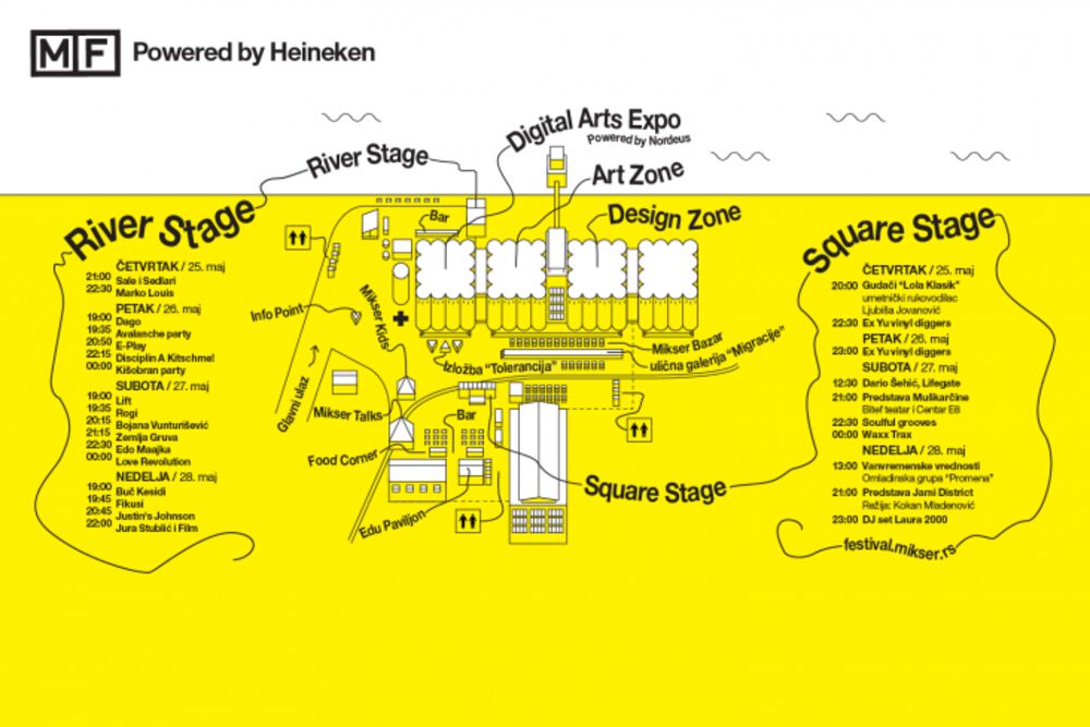 Svečano otvaranje festivala zakazano je za danas u 20.00 časova i tom prilikom posetioce će na Square bini dočekati gudački orkestra "Lola Klasik". Posle ponoći Love Revolution Party povešće vas na putovanje kroz svet tolerancije i ljubavu za sve nas. Ovom prilikom u okviru posebnog izdanja festivalske žurke nastupiće popularni grčki house duo Bang La decks i izraelski DJ i producent Sagi Abitbul. Još neka od muzičkih imena koja će nastupiti na Mikser festivalu su: Jura Stublić i Film, Disciplina Kitschme, Edo Majka, britanski Avalanche Party, E-plaz, Zemlja gruva, Bojana Vunturiševići mnogi drugi.