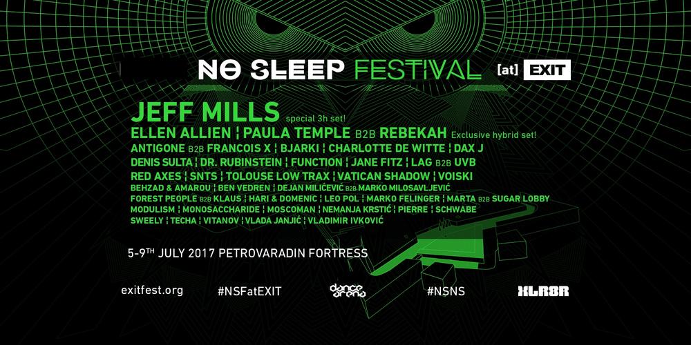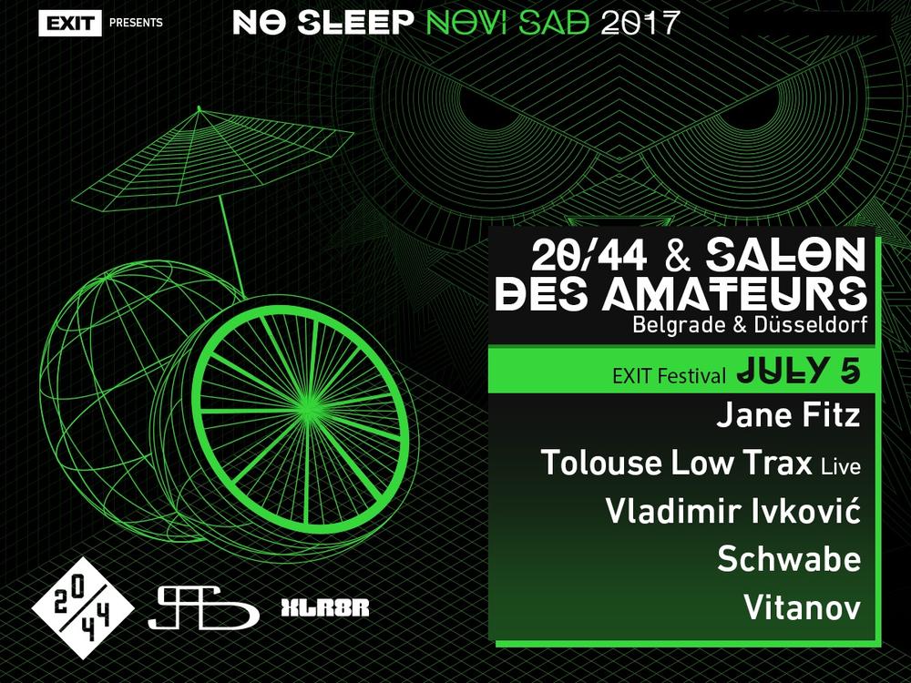 Nakon što je na Petrovaradinsku tvrđavu dovela čuvene svetske klubove i organizovala žurke u Londonu, Barseloni, Briselu i drugim metropolama, #NSNS će na jednu noć preuzeti i kolosalnu Dance Arenu. Tako će se nultog dana održati prvi Festival na Exitu, u okviru kojeg će na Areni nastupati Jeff Mills, Ellen Allien, Paula Temple & Rebekah, Lag b2b UVB, Dejan Milićević b2b Marko Milosavljević i Marta b2b Sugar Lobby. A nakon što je objavljen dolazak čuvenih svetskih klubova Sub Club, Fuse, Avant Garde i Concrete, na matičnoj No Sleep Novi Sad bini, u sredu 5. jula pridružiće im se još dva! Direktno iz zgrade dizeldorfskog Kunsthallea na EXIT stiže fascinantni Salon Des Amateurs, a dočekuje ga brod koji ponovo ka tvrđavi plovi pravo iz centra koordinatnog sistema beogradske scene, sa dobro poznatim brojkama: 20/44! Ulaz na No Sleep Festival slobodan je uz svaku EXIT ulaznicu, bilo da je petodnevna, četvorodnevna ili bilo koja jednodnevna.