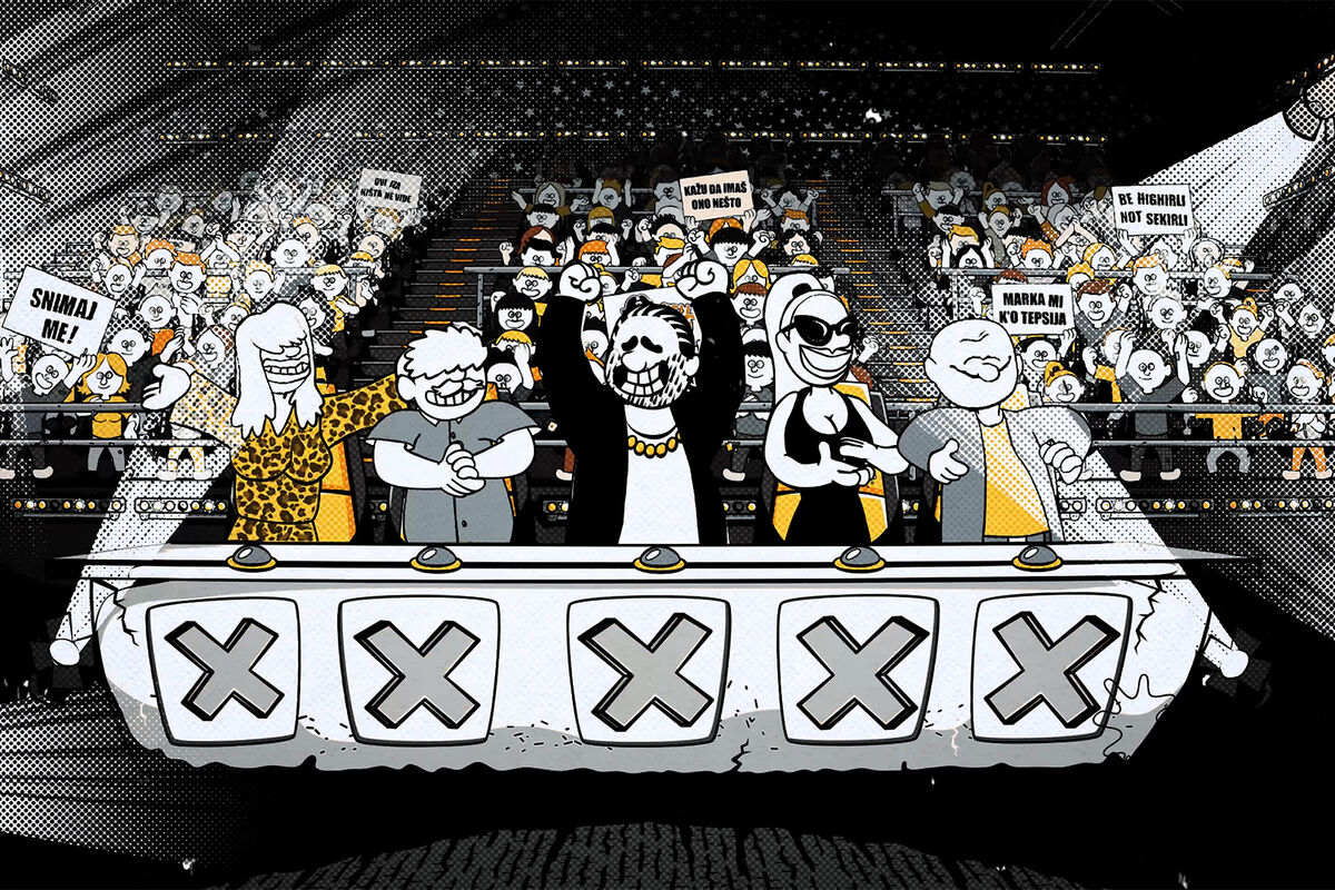 Momci iz Dubioza kolektiva sviraju na sceni popularnog talent šoua, dok publika u transu vrišti, a žiri sastavljen od poznatih lica negoduje i pritiska dugmiće za eliminaciju.
